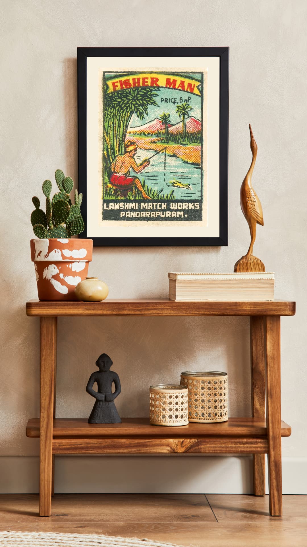 Scenes of rural labour and riverside life were common on mid-century labels, celebrating everyday occupations while appealing to a shared sense of familiarity. The calm water, palm trees and figure in the foreground create a tableau of livelihood and landscape.
