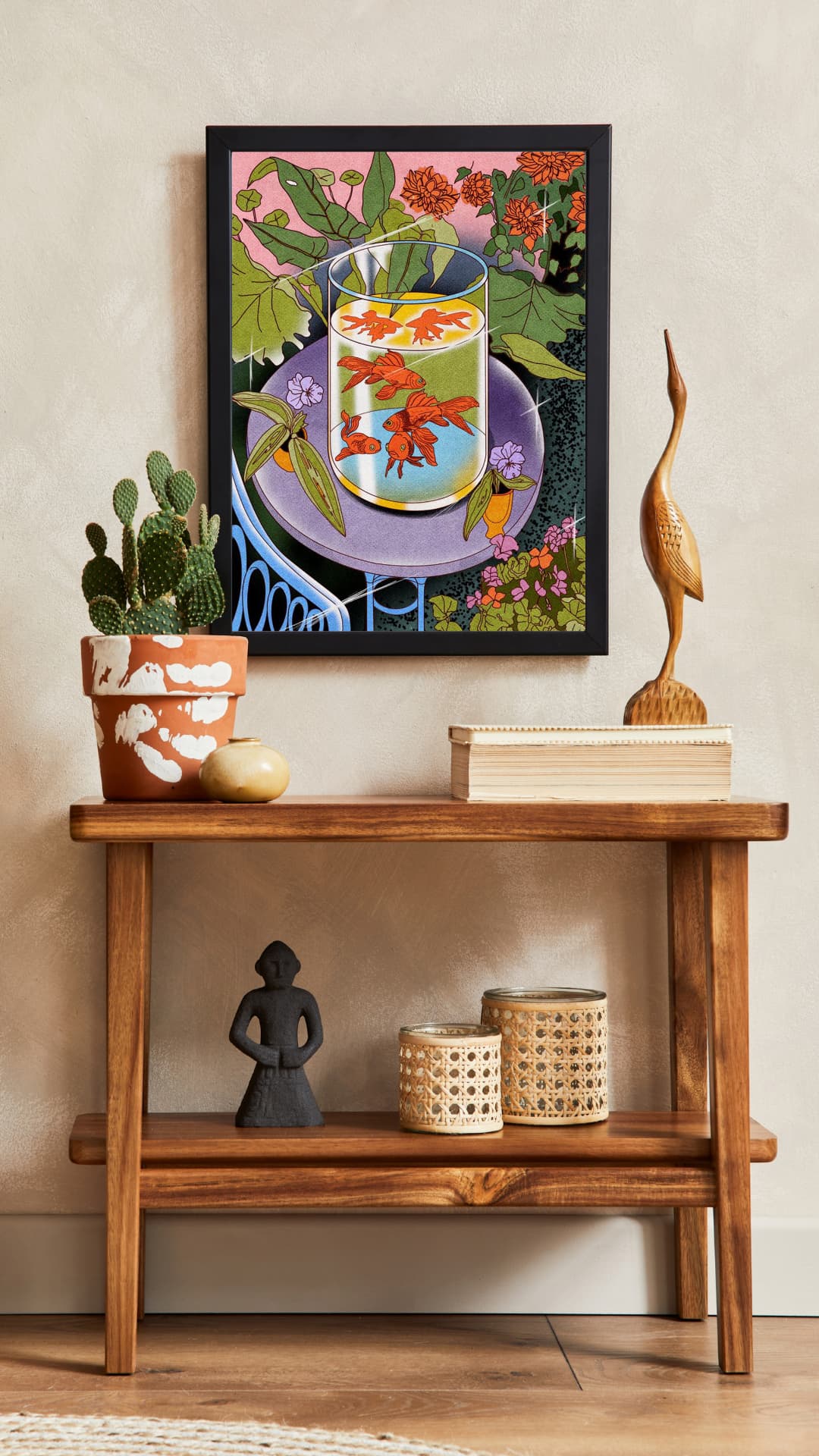 Goldfish drifting among soft plants create a small, gentle world on the wall. Perfect for bedrooms, cosy corners, and any space that would benefit from a quiet, peaceful detail.