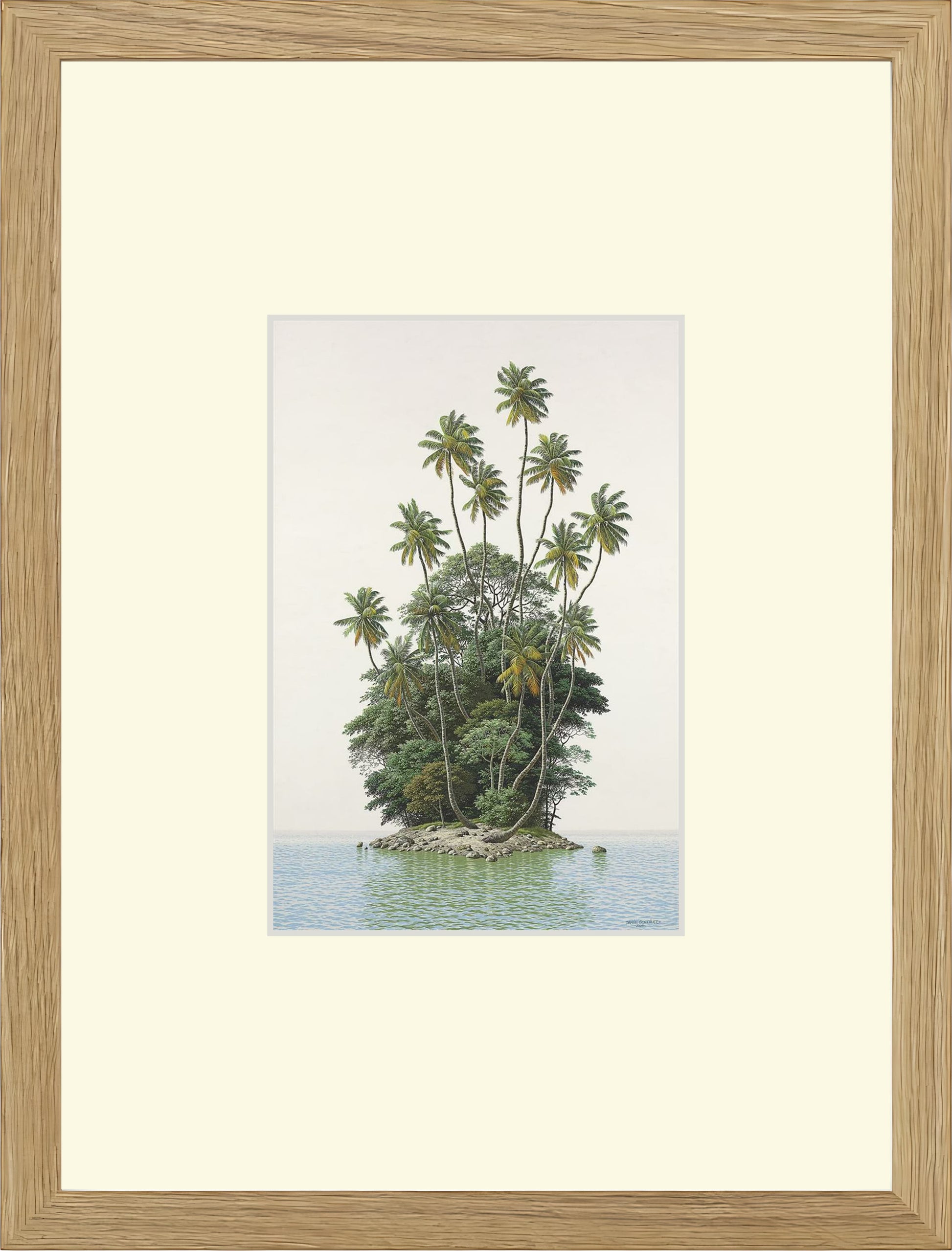 Though rendered with precise detail, the scene nudges toward the atmospheric. The height of the palms, their gentle lean, and the quiet water around them give the island a sense of serene self-containment, as if it exists slightly outside time. It becomes a symbol of retreat, of the small corners of the world where stillness gathers and the mind is invited to breathe a little slower.
