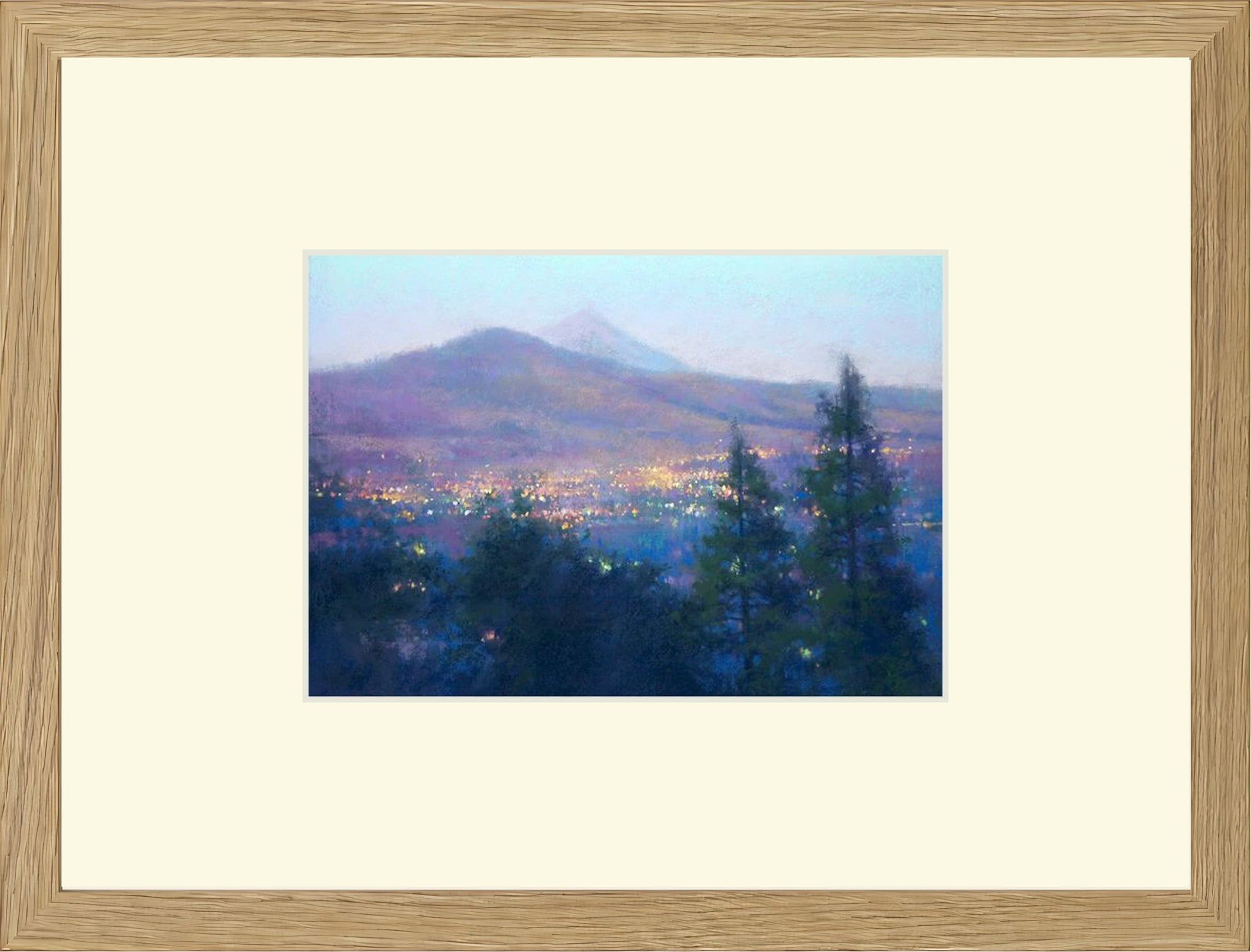 A city glows at the base of distant mountains, its scattered lights echoing the gentle colors of the sky as evening settles in. The trees in the foreground rise in shadow, creating a sense of depth that draws the viewer toward the softly illuminated peaks. The cool atmosphere gives the mountains a light veil, making them appear both near and slightly out of reach.