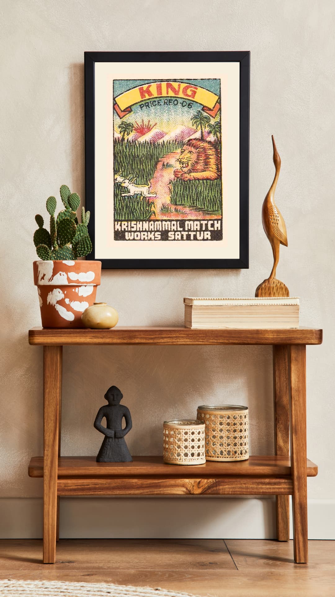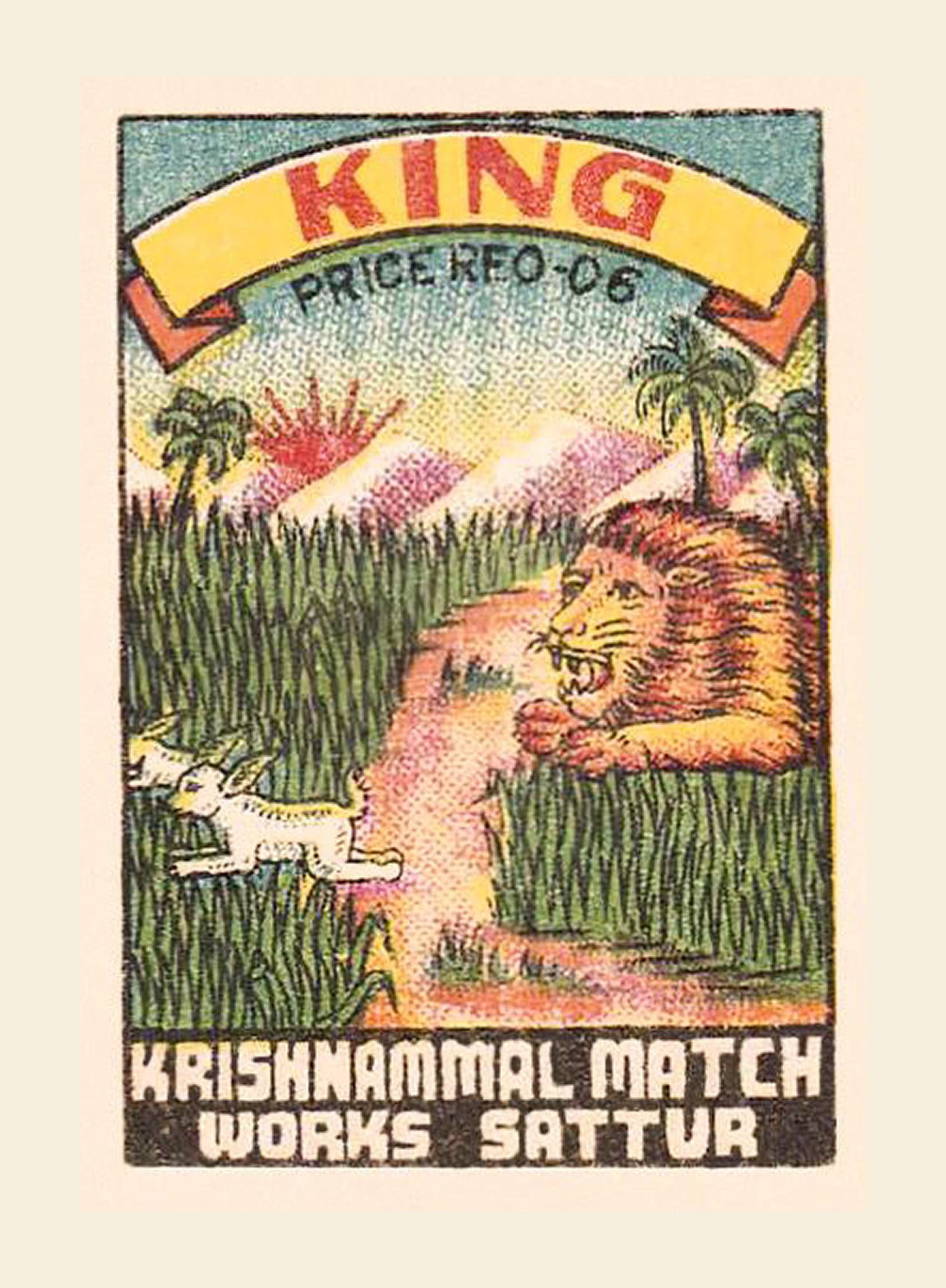 Here, the lion serves as a symbol of authority and protection, common in Indian matchbox art. The dramatic landscape enhances its stately presence, promising strength through visual metaphor.