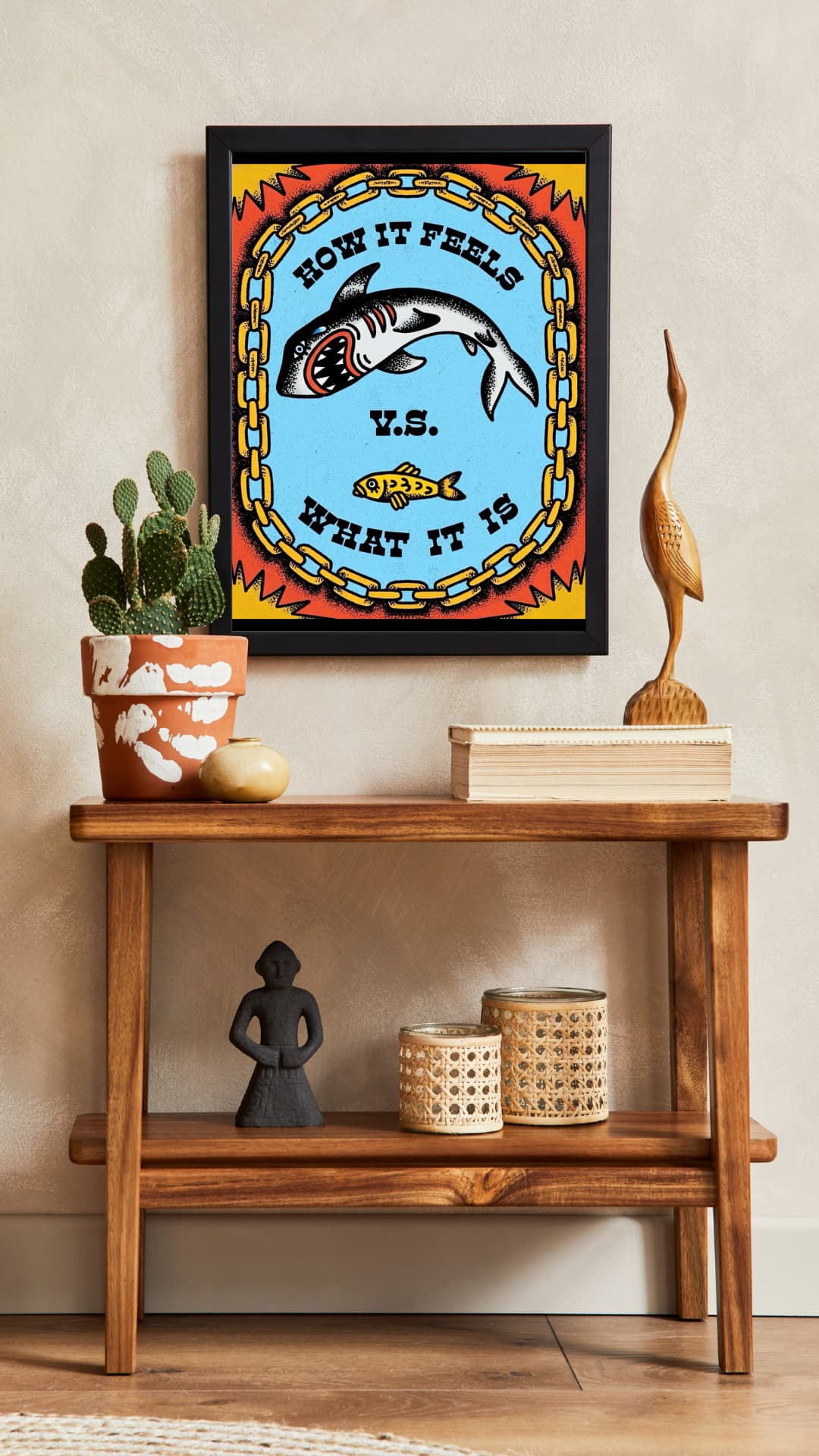 This artwork reminds you to check in with what’s actually in front of you instead of what your anxiety is inventing. Keep it on your wall as a cue to pause, breathe, and maybe even journal what’s real versus what’s imagined. The gap between the two is often huge.