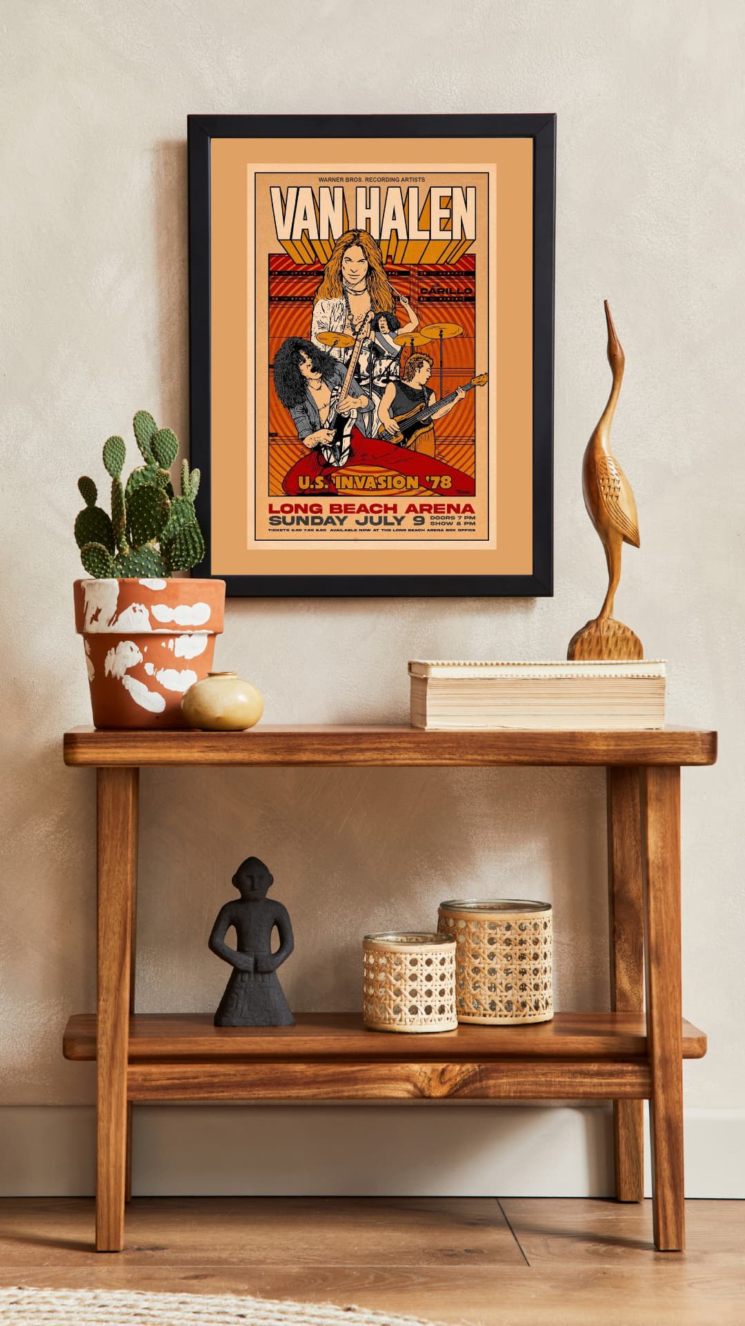 This poster is tied to Van Halen’s 1978 U.S. Invasion Tour, their first major run across America after releasing their debut album. The tour was known for its raw, high-energy shows, Eddie Van Halen’s early “Eruption” performances, and David Lee Roth at his most electric on stage. The artwork reflects the late-70s rock promotion, when the band was still introducing itself to new crowds night after night.